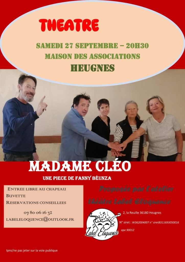 Samedi 27 septembre à 20h30, venez nombreux à la Maison des Associations de Heugnes pour voir la pièce “Madame Cléo“.